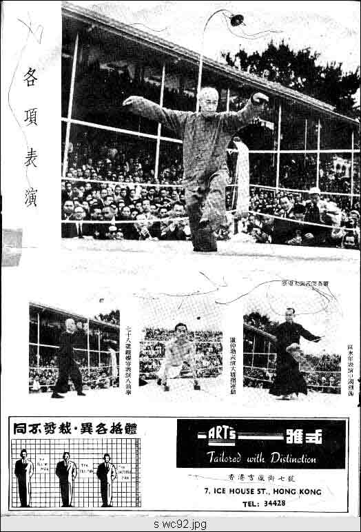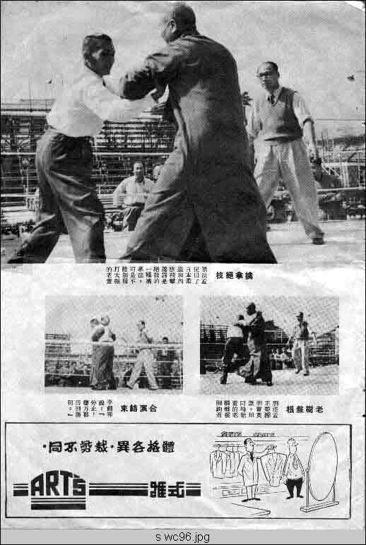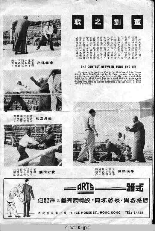 Tidningsartiklar från en berömd välgörenhetsmatch i Hong Kong 1954 mellan en Tai Chi-mästare och en White Crane mästare. Mäster Tung Ying Chieh och mäster Lau demonstrerade reglerna matchen i en vänskapsmatch